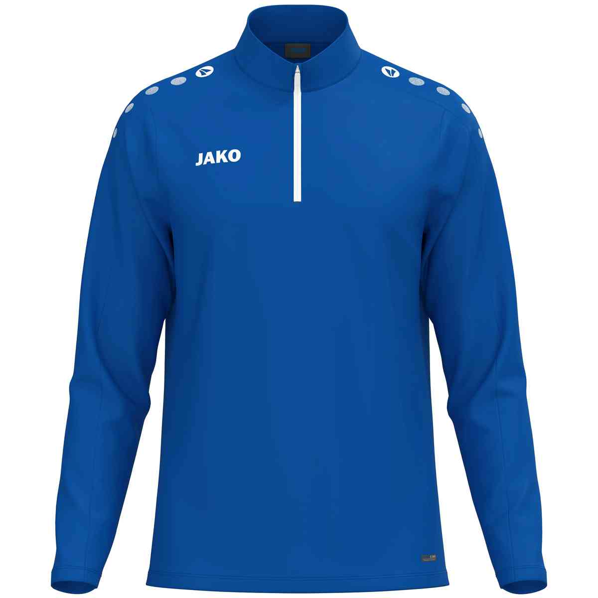 Das Ziptop ist in einer Hauptteamsportfarbe gehalten und verfügt lediglich im Bereich der oberen Brust über eine kleine farbliche Applikation. Auf den Schultern und Ärmel befinden sich die typischen Jako Kreise. Das Top ist in 6 unterschiedlichen Teamsportfarben erhältlich